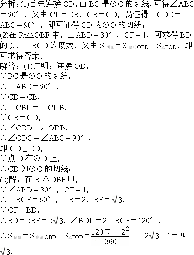 (2)若BD的弦心距OF=1,∠ABD=30°,求圖中陰影部分的面積.(結(jié)果保留π)