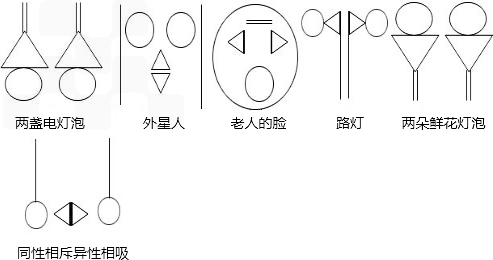 32、請以給定的圖形“”(兩個圓、兩個三角形,兩條平行線段)為構(gòu)件,構(gòu)思出一幅獨特且有意義的圖形,并寫出一句貼切、詼諧的解說詞.如圖就是符合要求的一幅圖,你還能構(gòu)思出其他的圖形嗎?請畫出來,并寫出解說詞.