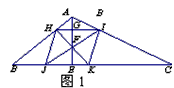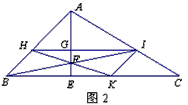 | 解: (1)∵點G與點E關(guān)于點F對稱,∴GF=FE ∵HI∥BC,∴∠GIF=∠EJF, 又∵∠GFI=∠EFJ,∴△GFI≌△EFJ, ∴GI=JE 同理可得HG=EK ,∴HI=JK ∴四邊形HIKJ是平行四邊形 (2)當(dāng)F是AE的中點時,A、G重合,所以AF=2.5 如圖1,∵AE過平行四邊形HIJK的中心F, ∴HG=EK,GI=JE ∴ ∵CE>BE,∴GI> HG, ∴CK>BJ. ∴當(dāng)點F在AE上運動時,點K、J 隨之在BC上運動, 如圖2,當(dāng)點F的位置使得B、J重合時,這時點K仍為CE上的某一點(不與C、E重合), 而且點H、I也分別在AB、AC上 設(shè)EF=x,∵∠AHG=∠ABC=45°,AE=5, ∴BE=5=GI,AG=HG=5-2x,CE= ∵△AGI∽△AEC, ∴AG∶AE=GI∶CE. ∴(5-2x)∶5=5∶( ∴x=1,∴AF=5-x=4 ∴ |