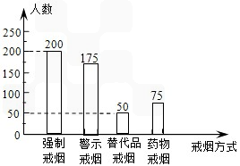 吸煙有害健康,為配合“戒煙”運(yùn)動(dòng),某校組織同學(xué)們?cè)谏鐓^(qū)開展了“你支持哪種戒煙方式”的隨機(jī)問卷調(diào)查,并將調(diào)查結(jié)果繪制成兩幅不完整的統(tǒng)計(jì)圖: