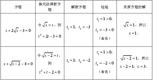 | 方程 | 換元法得新方程 | 解新方程 | 檢驗(yàn) | 求原方程的解 | ||||||||||||||