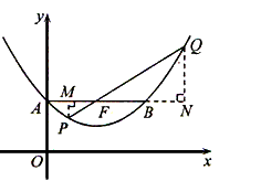 | (II)①根據(jù)題意,可得點(diǎn)A(0,1), ∵F(1,1), ∴AB∥x軸, 得AF=BF=1, ② 理由如下: 如圖,過(guò)點(diǎn)P( ∴Rt△PMF中,由勾股定理,得 又點(diǎn)P( 得 ∴ 即 過(guò)點(diǎn)Q( 同理可得 圖文∠PMF=∠QNF=90°,∠MFP=∠NFQ, ∴△PMF∽△QNF 有 這里 ∴ 即 |