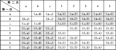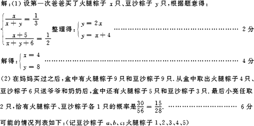 (2)若媽媽從盒中取出火腿粽子4只、豆沙粽子6只送爺爺和奶奶后,再讓小亮從盒中不放回地任取2只,問恰有火腿粽子、豆沙粽子各1只的概率是多少?(用字母和數(shù)字表示豆沙粽子和火腿粽子,用列表法計算)