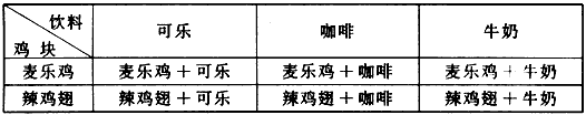 雅典奧運會期間,麥當(dāng)勞的武漢連鎖店推出優(yōu)惠銷售活動,雞塊品種有:麥樂雞、辣雞翅;主要飲料品種有:可樂、咖啡、牛奶,如果小玲想按上述品種隨意點一份雞塊和一杯飲料。