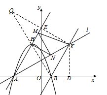 | (3)直線AH的解析式為 直線BK的解析式為 由 解得 即 ∵點H、B關(guān)于直線AK對稱, ∴HN+MN的最小值是MB, 過點K作直線AH的對稱點Q,連接QK,交直線AH于E, 則QM=MK, ∴BM+MK的最小值是BQ,即BQ的長是HN+NM+MK的最小值, ∵BK∥AH, ∴∠BKQ=∠HEQ=90°, 由勾股定理得QB=8, ∴HN+NM+MK的最小值為8, 答:HN+NM+MK和的最小值是8。 |