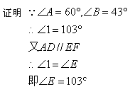 如圖,已知△ABC的AC邊的延長線AD∥EF,若∠A=60,∠B=43。,試用推理的格式求出∠E的大小。