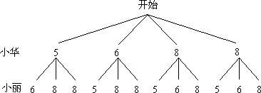 游戲B的規(guī)則:用4張數(shù)字分別是5,6,8,8的撲克牌,將牌洗勻后背面朝上放置在桌面上,小華先隨機抽出一張牌,抽出的牌不放回,小麗從剩下的牌中再隨機抽出一張牌.若小華抽出的牌面上的數(shù)字比小麗抽出的牌面上的數(shù)字大,則小華獲勝;否則小麗獲勝.