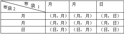 (本題滿分8分)在兩個布袋里分別裝有三張卡片,每個布袋的三張卡片中2張寫著“月”,1張寫著“日”,其他沒有區(qū)別。把兩袋里