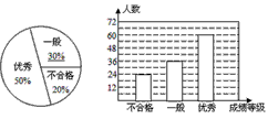 (11·漳州)(滿分8分)漳州市某中學對全校學生進行文明禮儀知識測試,為了解測試結果,隨機抽取部分學生的成績進行分析,將成績分為三個等級:不合格、一般、優(yōu)秀,并繪制成如下兩幅統(tǒng)計圖(不完整).請你根據(jù)圖中所給的信息解答下列問題:![]()