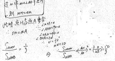 2.如圖2,若將Rt△AOB繞其直角頂點A順時針旋轉(zhuǎn)α度(0°<α<90°),得到Rt△ACD,直角邊AD與x軸相交于點N,直角邊AC與y軸相交于點M,連結MN。設△MON的面積為S△MON,△AOB的面積為S△AOB,以點M為圓心,MO為半徑作⊙M,