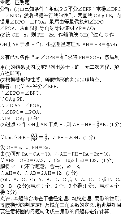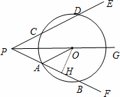 如圖,射線PG平分∠EPF,O為射線PG上一點,以O(shè)為圓心,10為半徑作⊙O,分別與∠EPF的兩邊相交于A、B和C、D,連接OA,此時有OA∥PE.