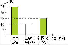 今年3月5日,光明中學組織全體學生參加了“走出校門,服務社會”的活動,活動分為打掃街道、去敬老院服務和到社區(qū)文藝演出三項。從九年級參加活動的同學中抽取了部分同學對打掃街道、去敬老院服務和到社區(qū)文藝演出的人數(shù)進行了統(tǒng)計,并做了如下直方圖和扇形統(tǒng)計圖。請根據(jù)兩個圖形,回答以下問題: