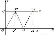 如圖,在平面直角坐標系中,O為坐標原點,四邊形OABC是矩形,點A、C的坐標分別為A(10,0)、C(0,4),點D是OA的中點,點P在BC邊上運動,當△ODP是腰長為5的等腰三角形時,點P的坐標為 。