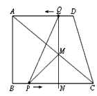 如圖,直角梯形ABCD中,AD∥BC,∠ABC=90°,已知AD=AB=3,BC=4,動(dòng)點(diǎn)P從B點(diǎn)出發(fā),沿線段BC向點(diǎn)C作勻速運(yùn)動(dòng);動(dòng)點(diǎn)Q從點(diǎn)D 出發(fā),沿線段DA向點(diǎn)A作勻速運(yùn)動(dòng),過(guò)Q點(diǎn)垂直于AD的射線交AC于點(diǎn)M,交BC于點(diǎn)N,P、Q兩點(diǎn)同時(shí)出發(fā),速度都為每秒1個(gè)單位長(zhǎng)度,當(dāng)Q點(diǎn)運(yùn)動(dòng)到A點(diǎn),P、Q兩點(diǎn)同時(shí)停止運(yùn)動(dòng),設(shè)點(diǎn)Q運(yùn)動(dòng)的時(shí)間為t秒。