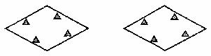 如圖,菱形公園內(nèi)有四個(gè)景點(diǎn),請(qǐng)你用兩種不同的方法,按下列要求設(shè)計(jì)成四個(gè)部分:⑴用直線分割;⑵每個(gè)部分內(nèi)各有一個(gè)景點(diǎn);⑶各部分的面積相等。(可用鉛筆畫,只要求畫圖正確,不寫畫法)