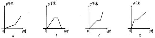 李老師騎自行車上班,最初以某一速度勻速行進(jìn),中途由于自行車發(fā)生故障,停下修車耽誤了幾分鐘,為了按時(shí)到校,李老師加快了速度,仍保持勻速行進(jìn),如果準(zhǔn)時(shí)到校.在課堂上,李老師請(qǐng)學(xué)生畫出他行進(jìn)的路程y(千米)與行進(jìn)時(shí)間t(小時(shí))的函數(shù)圖象的示意圖,同學(xué)們畫出的圖象如圖所示,你認(rèn)為正確的是( )