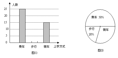 學習了統(tǒng)計知識后,小明就本班同學的上學方式進行了一次調查統(tǒng)計.圖(1)和圖(2)是他通過采集數(shù)據(jù)后,繪制的兩幅不完整的統(tǒng)計圖.請你根據(jù)圖中提供的信息,解答以下問題: