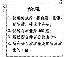 2011年5月20日是第22個(gè)中國學(xué)生營養(yǎng)日,某校社會實(shí)踐小組在這天開展活動(dòng),調(diào)查快餐營養(yǎng)情況。他們從食品安全監(jiān)督部門獲取了一份快餐的信息(如圖)。根據(jù)信息,解答下列問題。