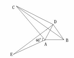 (3)如圖(2)將△ABC繞頂點(diǎn)A按逆時(shí)針方向旋轉(zhuǎn)60°,得到△DAE,連接BD、DC,∠DCA=30°,求證:DC2+AC2=BC2,即四邊形ABCD為勾股四邊形。