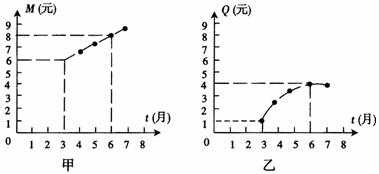 (2)求出圖(乙)中表示的一件商品的成本Q(元)與時(shí)間t(月)之間的函數(shù)關(guān)系式;