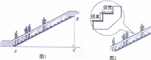 查看答案和解析>> 科目: 來源: 題型: 如圖1,某超市從一樓到二樓的電梯AB的長為16.50米,坡角∠BAC為32°。 (1)求一樓于二樓之間的高度BC(精確到0.01米); (2)電梯每級(jí)的水平級(jí)寬均是0.25米,如圖2.小明跨上電梯時(shí),該電梯以每秒上升2級(jí)的高度運(yùn)行,10秒后他上升了多少米(精確到0.01米)?備用數(shù)據(jù):sin32°=0.5299,con32°=0.8480,tan32°=6249。