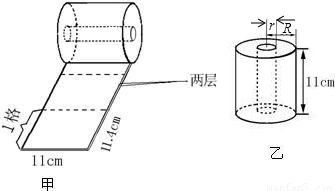 從衛(wèi)生紙的包裝紙上得到以下資料:兩層300格,每格11.4cm×11cm,如圖甲.用尺量出整卷衛(wèi)生紙的半徑(R)與紙筒內芯的半徑(r),分別為5.8cm和2.3cm,如圖乙.那么該兩層衛(wèi)生紙的厚度為多少cm?(π取3.14,結果精確到0.001cm)