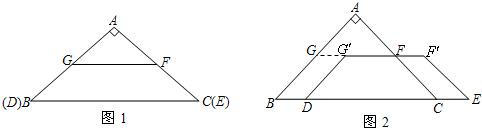 如圖1,在Rt△ABC中,∠A=90°,AB=AC,BC=4數(shù)學公式,另有一等腰梯形DEFG(GF∥DE)的底邊DE與BC重合,兩腰分別落在AB,AC上,且G,F(xiàn)分別是AB,AC的中點.