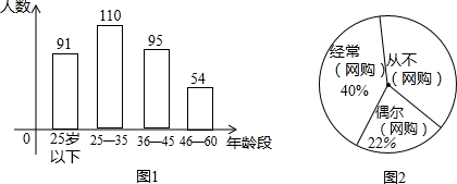 (3)這次調(diào)查中,“25-35”歲年齡段的職工“從不(網(wǎng)購)”的有22人,它占“25-35”歲年齡段接受調(diào)查人數(shù)的百分之幾?