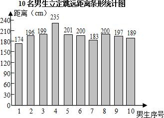 2012年南京市初中畢業(yè)生升學(xué)體育考試要求男生從立定跳遠(yuǎn)、投擲實(shí)心球等6個(gè)項(xiàng)目中任選三項(xiàng).某校九年級共有100名男生選擇了立定跳遠(yuǎn),現(xiàn)從這100名男生中隨機(jī)抽取10名男生進(jìn)行測試,下面是他們測試結(jié)果