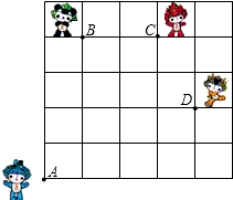 如圖,奧運福娃在5×5的方格(每小格邊長為1m)上沿著網(wǎng)格線運動.貝貝從A處出發(fā)去尋找B、C、D處的其它福娃,規(guī)定:向上向右走為正,向下向左走為負.如果從A到B記為:A→B(+1,+4),從B到A記為:B→A(-1,-4),其中第一個數(shù)表示左右方向,第二個數(shù)表示上下方向,那么圖中