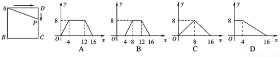 如圖,正方形ABCD的邊長為4,P為正方形邊上一動點,運動路線是A→D→C→B→A,設P點經過的路線為x,以點A、P、D為頂點的三角形的面積是y.則下列圖象能大致反映y與x的函數關系的是( )![]()