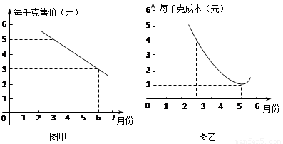 某瓜果基地市場(chǎng)部為指導(dǎo)該基地某種蔬菜的生產(chǎn)銷售,在對(duì)歷年市場(chǎng)行情和生產(chǎn)情況進(jìn)行調(diào)查的基礎(chǔ)上,對(duì)今年這種蔬菜上市后的市場(chǎng)售價(jià)和生產(chǎn)成本進(jìn)行了預(yù)測(cè),提供了兩個(gè)方面的信息,如圖(注:兩圖中的每個(gè)實(shí)心點(diǎn)所對(duì)應(yīng)的縱坐標(biāo)分別指相應(yīng)月份的售價(jià)和成本,生產(chǎn)成本6月份最低,圖甲的圖象是直線,圖乙的圖象是拋物線)