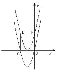 與x軸交于A,0兩點(diǎn),將拋物線向上移動(dòng)4個(gè)單位長度后得到一條新拋物線,它的頂點(diǎn)在x軸上,新拋物線上的D,E兩點(diǎn)分別是A,O兩點(diǎn)平移后的對(duì)應(yīng)點(diǎn)。設(shè)兩條拋物線、線段AD和線段OE圍成的面積為S。P(m,n)是新拋物線上一個(gè)動(dòng)點(diǎn),切滿足![]()