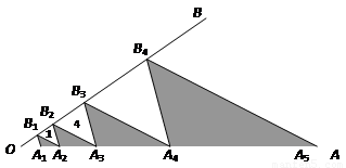 如圖,點A1,A2,A3,A4,…,An在射線OA上,點B1,B2,B3,…,Bn―1在射線OB上,且A1B1∥A2B2∥A3B3∥…∥An―1Bn―1,A2B1∥A3B2∥A4B3∥…∥AnBn―1,△A1A2B1,△A2A3B2,…,△An―1AnBn―1為陰影三角形,若△A2B1B2,△A3B2B3的面積分別為1、4,則△A1A2B1的面積為__________;面積小于2011的陰影三角形共有__________個.