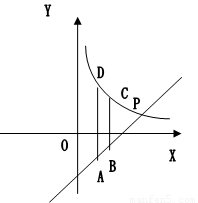 的圖象與直線y=x+m在第一象限交于點(diǎn)P(6,2),A、B為直線上的兩點(diǎn),點(diǎn)A的橫坐標(biāo)為2,點(diǎn)B的橫坐標(biāo)為3.D、C為反比例函數(shù)圖象上的兩點(diǎn),且AD、BC平行于y軸。