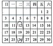下圖是2012年6月份的日歷。像圖中那樣,用一個(gè)圈豎著圈住3個(gè)數(shù)。如果被圈住的三個(gè)數(shù)的和為42,那么這三個(gè)數(shù)中最大的一個(gè)數(shù)為____________