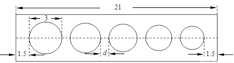 有一種用來畫圓的工具板(如圖所示),工具板長21cm,上面依次排列著大小不等的五個圓(孔),其中最大圓的直徑為3cm,其余圓的直徑從左到右依次遞減0.2cm. 最大圓的左側(cè)距工具板左側(cè)邊緣1.5cm,最小圓的右側(cè)距工具板右側(cè)邊緣1.5cm,相鄰兩圓的間距d均相等.