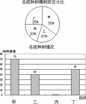 紅星中學開展了“綠化家鄉(xiāng),植樹造林”活動,并對該校的甲、乙、丙、丁四個班級種樹情況進行了考察,并將收集的數(shù)據(jù)繪制了圖①和圖②兩幅尚不完整的統(tǒng)計圖.