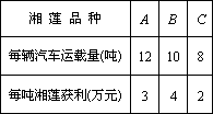 我市花石鎮(zhèn)組織10輛汽車裝運(yùn)完A、B、C三種不同品質(zhì)的湘蓮共100噸到外地銷售,按計(jì)劃10輛汽車都要裝滿,且每輛汽車只能裝同一種湘蓮,根據(jù)下表提供的信息,解答以下問(wèn)題: