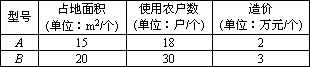 為執(zhí)行中央“節(jié)能減排,美化環(huán)境,建設(shè)美麗新農(nóng)村”的國(guó)策,我市某村計(jì)劃建造A、B兩種型號(hào)的沼氣池共20個(gè),以解決該村所有農(nóng)戶的燃料問(wèn)題.兩種型號(hào)沼氣池的占地面積、使用農(nóng)戶數(shù)及造價(jià)見(jiàn)下表: