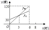 某部隊甲、乙兩班參加植樹活動.乙班先植樹30棵,然后甲班才開始與乙班一起植樹.設甲班植樹的總量為y(棵),乙班植樹的總量為y(棵),兩班一起植樹所用的時間(從甲班開始植樹時計時)為x(時).y、y分別與x之間的部分函數(shù)圖象如圖所示.