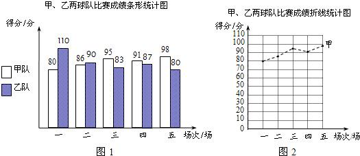 甲、乙兩支籃球隊在集訓(xùn)期內(nèi)進行了五場比賽,將比賽成績進行統(tǒng)計后,繪制成如圖1、圖2的統(tǒng)計圖.