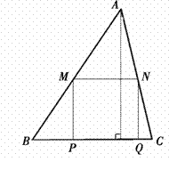 兩動點(diǎn)M、N分別在邊AB、AC上滑動,且MN∥BC,以MN為邊向下作正方形MPQN,設(shè)其邊長為x,正方形MPQN與△ABC公共部分的面積為y(y >0),當(dāng)x = ,公共部分面積y最大,y最大值 = ,