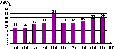 | 上海世博會自2010年5月1日到10月31日,歷時184天,預(yù)測參觀人數(shù)達(dá)7000萬人次,如圖是此次盛會在5月中旬入園人數(shù)的統(tǒng)計情況。 | ||||||||