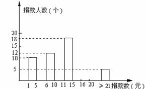 一方有難,八方支援”,在四川汶川大地震后,某市文華中學全體師生踴躍捐款,向災區(qū)人民獻愛心. 為了了解該校學生捐款情況,對其中60個學生捐款數(shù)x(元)分五組進行統(tǒng)計,第一組:1≤x≤5,第二組:6≤x≤10,第三組:11≤x≤15,第四組:16≤x≤20;,第五組:x≥21,并繪制如下頻數(shù)分布直方圖(假定每名學生捐款數(shù)均為整數(shù)),解答下列問題: