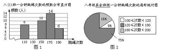 某校積極開展每天鍛煉1小時活動,老師對本校八年級學生進行一分鐘跳繩測試,并對跳繩次數(shù)進行統(tǒng)計,繪制了八(1)班一分鐘跳繩次數(shù)的頻數(shù)分布直方圖和八年級其余班級一分鐘跳繩次數(shù)的扇形統(tǒng)計圖.已知在圖1中,組中值為190次一組的頻率為0.12.(說明: 組中值為190次的組別為 180≤次數(shù)<200)