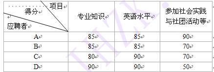 新星公司到某大學(xué)從應(yīng)屆畢業(yè)生中招聘公司職員,對應(yīng)聘者的專業(yè)知識、英語水平、參加社會實(shí)踐與社團(tuán)活動等三項(xiàng)進(jìn)行測試或成果認(rèn)定,三項(xiàng)的得分滿分都為100分,三項(xiàng)的分?jǐn)?shù)分別按5∶3∶2的比例記入每人的最后總分,有4位應(yīng)聘者的得分如下表所示