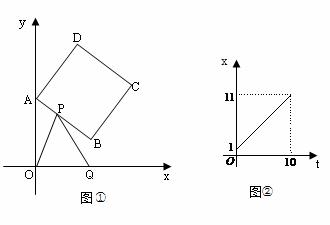 如圖①,正方形 ABCD中,點A、B的坐標分別為(0,10),(8,4),點C在第一象限.動點P在正方形 ABCD的邊上,從點A出發(fā)沿A→B→C→D勻速運動,同時動點Q以相同速度在x軸正半軸上運動,當P點到達D點時,兩點同時停止運動,設(shè)運動的時間為t秒.