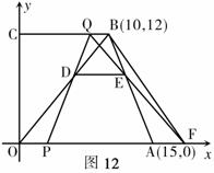 如圖,在直角梯形OABC中, OA∥CB,A、B兩點的坐標分別為A(15,0),B(10,12),動點P、Q分別從O、B兩點出發(fā),點P以每秒2個單位的速度沿OA向終點A運動,點Q以每秒1個單位的速度沿BC向C運動,當(dāng)點P停止運動時,點Q也同時停止運動.線段OB、PQ相交于點D,過點D作DE∥OA,交AB于點E,射線QE交
