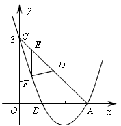 | 當(dāng)x=2時,拋物線y=ax2+bx+c取得最小值-1,并且拋物線與y軸交于點C(0,3),與x軸交于點A、B. (1)求該拋物線的關(guān)系式; (2)若點M(x,y1),N(x+1,y2)都在該拋物線上,試比較y1與y2的大; (3)D是線段AC的中點,E為線段AC上一動點(A、C兩端點除外),過點E作y軸的平行線EF與拋物線交于點F.問:是否存在△DEF與△AOC相似?若存在,求出點E的坐標(biāo);若不存在,則說明理由. |
